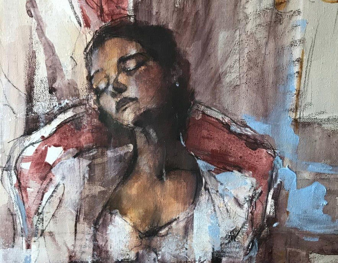 I'm really enjoying portraiture at the moment. Lockdown has given me the perfect opportunity to indulge in this.  I recently discovered this image and was drawn to the relaxed, calm pose.                                                    Before lockdown I made a quick dash to the art shop to pick up some supplies. One of the things that caught my eye was a chocolate coloured watercolour pencil. I've used it when forming the structure of quite a few pieces and it works really well creating the warm tones.                       Instead of applying a wash I've worked acrylic paint directly into the drawing.                                                                                                The colours I've used are Burnt Sienna, Flesh Pink, Prussian Blue, Raw Sienna and Raw Umber.                                                                Using downward strokes I've carefully blended the colours together.  I've used stencilling to create texture in the dress.